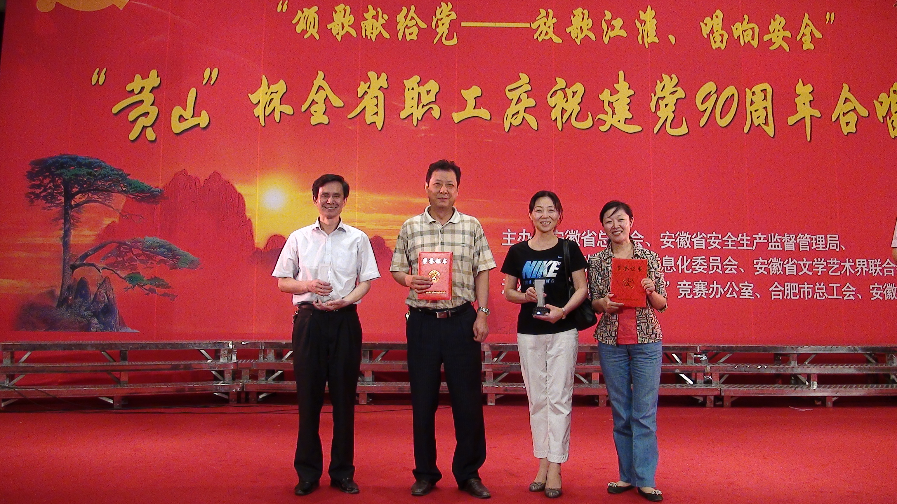 6月19日,“黃山”杯全省職工慶祝建黨90周年合唱展演在市政務(wù)中心大禮堂隆重舉行。省委常委、省總工會主席王秀芳,省政府副秘書長黃曉武,省安監(jiān)局局長程傳如,省總工會常務(wù)副主席李維勇、副主席夏育才,市委副書記熊建輝以及省直有關(guān)部門負責人觀看演出并為獲獎單位頒獎。
