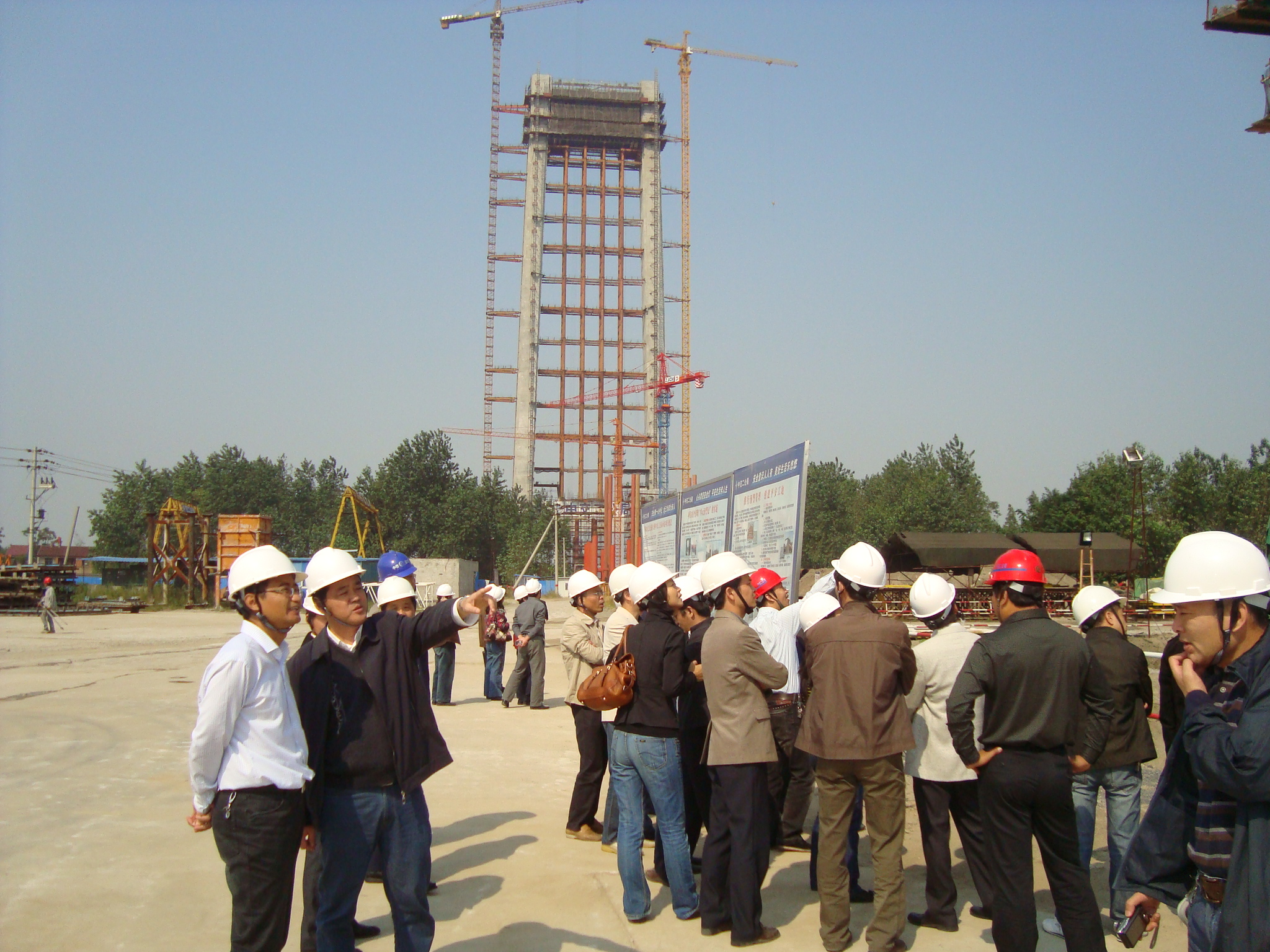 大家一到馬鞍山就集聚在大橋指揮部會議室,指揮部殷永高處長代表馬橋指揮部對安徽建工集團(tuán)觀摩團(tuán)一行表示熱烈歡迎,希望雙方增進(jìn)交流,并期待與安徽建工集團(tuán)今后在長江大橋建設(shè)領(lǐng)域進(jìn)一步合作。殷處長簡要說明了2008年開工以來大橋的基本建設(shè)情況,重點(diǎn)介紹了馬橋項(xiàng)目質(zhì)量安全管理方面所采取的創(chuàng)新管理方法和在科技創(chuàng)新上所取得的一系列重大突破:建立完善的質(zhì)量管理體系,實(shí)行精細(xì)化管理,推進(jìn)生產(chǎn)質(zhì)量安全信息化管理,組織編制出版了《施工質(zhì)量標(biāo)準(zhǔn)化》和《施工安全標(biāo)準(zhǔn)化》;開展了“根鍵式鉆孔灌注樁”、“根式沉井基礎(chǔ)”、“根式錨碇基礎(chǔ)”以及“多塔連跨懸索橋非飄移結(jié)構(gòu)體系研究”、“ 千米級三塔懸索橋上部結(jié)構(gòu)安裝關(guān)鍵技術(shù)研究”、“ 拱塔斜拉橋關(guān)鍵技術(shù)及模型試驗(yàn)研究”、“三塔懸索橋施工與運(yùn)營關(guān)鍵狀態(tài)極限承載能力研究” 等關(guān)鍵技術(shù)研究。同時(shí)為滿足中塔鋼節(jié)段的吊裝要求,組織研發(fā)了D5200-240型世界最大噸位塔吊。上述多項(xiàng)技術(shù)達(dá)到世界領(lǐng)先水平,獲得多項(xiàng)發(fā)明專利。