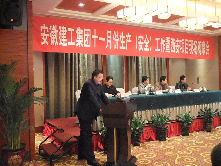 11月4日,安徽建工集團(tuán)十一月份生產(chǎn)(安全)工作暨西安項(xiàng)目現(xiàn)場(chǎng)觀摩會(huì)在安徽三建西北公司召開(kāi)。集團(tuán)公司副總經(jīng)理、總工程師戴良軍、總經(jīng)理助理郭道真、各單位分管領(lǐng)導(dǎo)、安全部門(mén)負(fù)責(zé)人及集團(tuán)公司機(jī)關(guān)部門(mén)負(fù)責(zé)人等50多人參加了會(huì)議。與會(huì)人員觀摩了西安市繞城基地項(xiàng)目施工現(xiàn)場(chǎng)。項(xiàng)目經(jīng)理就工程概況、工程進(jìn)度、項(xiàng)目管理及工程重難點(diǎn)、質(zhì)量控制、安全生產(chǎn)、文明創(chuàng)建以及企業(yè)文化宣傳等各方面建設(shè)情況進(jìn)行了匯報(bào)。安徽三建西北公司經(jīng)理劉順利就西北公司的成立、發(fā)展、經(jīng)營(yíng)規(guī)模、取得成績(jī)和發(fā)展方向等進(jìn)行了介紹。