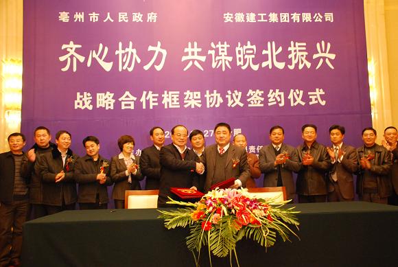 胡運成董事長在致辭中指出,隨著工業(yè)化進程的顯著加快和城市化水平的快速提升,亳州市勞動力資源豐富和投資環(huán)境優(yōu)良的優(yōu)勢日益凸顯,加之省委、省政府密集出臺支持皖北地區(qū)發(fā)展的一系列政策措施,亳州必將迎來新的黃金發(fā)展機遇期。亳州市的加快發(fā)展對市場建設(shè)規(guī)模、建筑業(yè)管理水平和專業(yè)技術(shù)人才提出了更高的要求。在當前“和諧發(fā)展、全面轉(zhuǎn)型、加速崛起、興皖富民”的大背景和省委、省政府大力支持皖北地區(qū)經(jīng)濟發(fā)展的良好機遇下,安徽建工正在致力于實現(xiàn)“安徽建筑的創(chuàng)新服務(wù)領(lǐng)導(dǎo)者”的戰(zhàn)略愿景。同時,安徽建工擁有雄厚的資本、成熟的項目管理和工程施工經(jīng)驗以及大批優(yōu)秀的專業(yè)技術(shù)人員,在業(yè)內(nèi)具有優(yōu)質(zhì)的品牌和顯著的業(yè)績。因此,雙方的互補優(yōu)勢明顯,合作前景廣闊。安徽建工與亳州市政府建立戰(zhàn)略合作關(guān)系,既是亳州市委、市政府對安徽建工的信任,也是安徽建工支持亳州市建筑業(yè)義不容辭的責任。這對于發(fā)揮省屬大型骨干建筑企業(yè)的帶動力和輻射力,提升亳州建筑業(yè)發(fā)展水平,促進經(jīng)濟社會實現(xiàn)率先突破發(fā)展具有重大意義。
