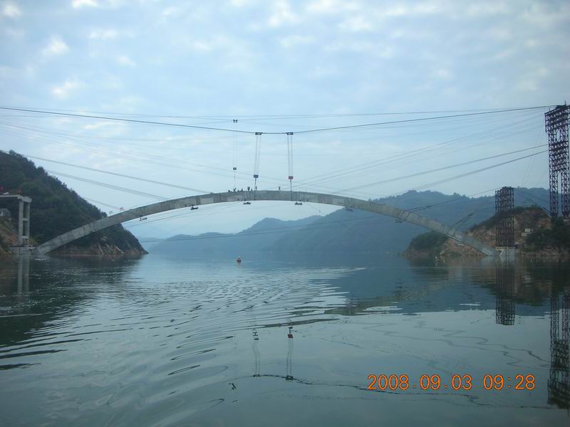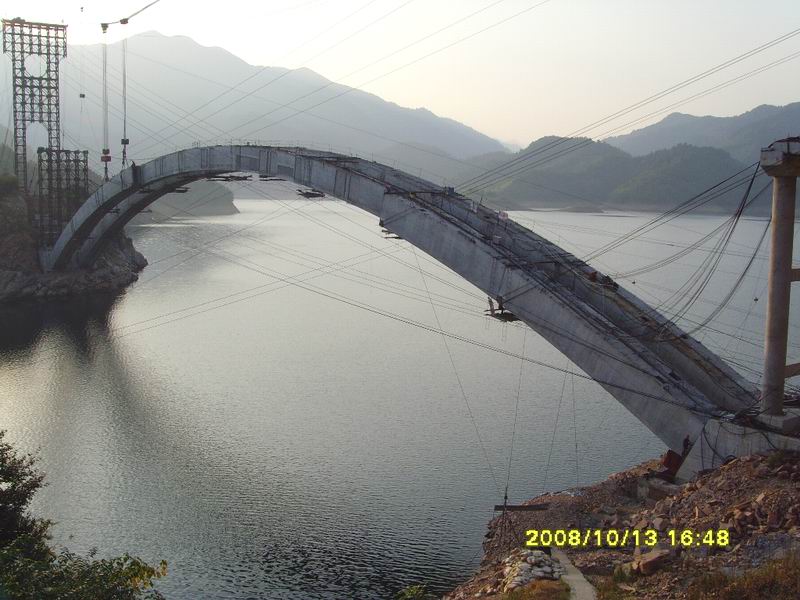 安徽省路橋公司承建的金桃大橋位于金寨縣,跨越梅山水庫。主橋采用二孔跨度均為160米的上承式鋼筋混凝土箱肋拱,引橋采用跨度13米的簡支空心板,橋梁全長491米。由于大橋跨越梅山水庫,箱拱、拱上立柱、系梁、蓋梁全部采用纜索吊裝,施工難度大。