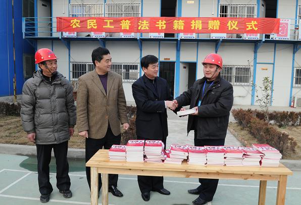 2010年元月28日下午,合肥市人民檢察院向安徽建工農(nóng)民工業(yè)余學(xué)校捐贈(zèng)農(nóng)民工普法書(shū)籍儀式在安徽三建美亞光電項(xiàng)目部舉行。市檢察院黨組成員、副檢察長(zhǎng)黃世斌,黨組成員、政治部主任童興芝等一行四人,看望慰問(wèn)農(nóng)民工兄弟,宣傳農(nóng)民工法律維權(quán)知識(shí),并現(xiàn)場(chǎng)捐贈(zèng)《農(nóng)民工普法讀本》200本。集團(tuán)公司副總經(jīng)理、集團(tuán)農(nóng)民工業(yè)余學(xué)校常務(wù)副校長(zhǎng)王禮義,集團(tuán)人力資源部主任胡建英,安徽三建紀(jì)委書(shū)記周湃等出席捐贈(zèng)儀式。