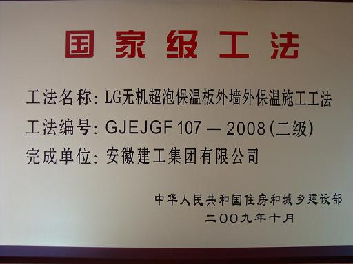 3月29日,國(guó)家級(jí)工法成果推廣與經(jīng)驗(yàn)交流研討會(huì)在北京召開。原建設(shè)部副部長(zhǎng)、中國(guó)建筑業(yè)協(xié)會(huì)會(huì)長(zhǎng)鄭一軍,住房和城鄉(xiāng)建設(shè)部總經(jīng)濟(jì)師李秉仁等出席研討會(huì)。會(huì)議向獲得2007年-2008年度國(guó)家級(jí)工法的完成單位頒發(fā)了獎(jiǎng)牌和證書。安徽建工集團(tuán)有限公司編制的《LG無(wú)機(jī)超泡保溫板外墻外保溫施工工法》(GJEJEF107-2008)被評(píng)為國(guó)家級(jí)工法,此次國(guó)家級(jí)工法的申報(bào)成功,不僅是集團(tuán)公司堅(jiān)持技術(shù)創(chuàng)新取得又一突破,更為集團(tuán)公司特級(jí)資質(zhì)就位奠定了一定的基礎(chǔ)。